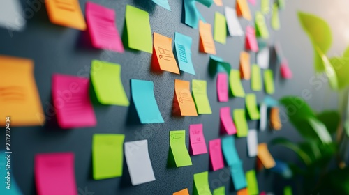Close-up of a gray wall covered with a mix of colorful sticky notes, each one displaying a different task or reminder