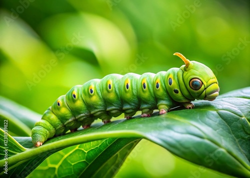 Close-up of a Green Caterpillar on a Leaf with Copy Space - Stock Photo