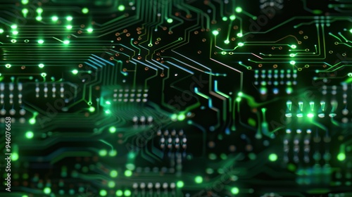 Close-up of a green circuit board with vibrant lights, illustrating modern technology, digital networks, and electronic components.