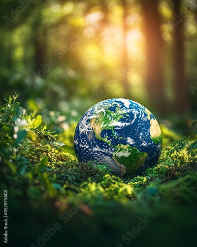 Closeup of a green forest with a glowing Earth globe hovering above, representing the concept of sustainable environmental care and achieving carbon emissions reduction