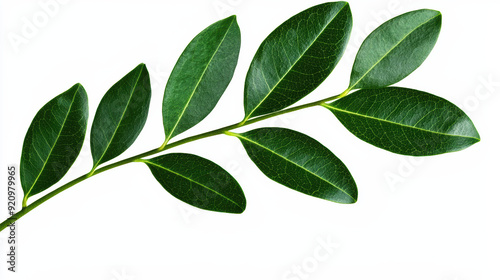 Close-up of a green leaf branch with multiple leaves, isolated on white background. Detailed veins and vibrant green color, symbolizing nature and freshness.