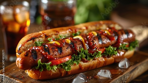 Close-up of a grilled hot dog with mustard and ketchup on a bun with lettuce and tomato, served on a wooden cutting board with ice cubes.
