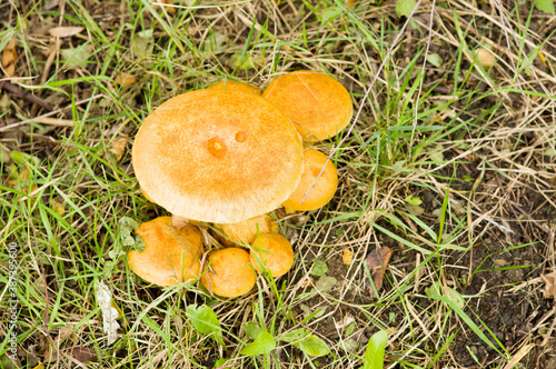Closeup of a group of wild Enokitake mushrooms in meadow with grass