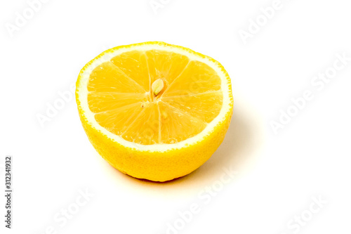 Close-up of a half lemon, with a seed cut in half, isolated on white background.