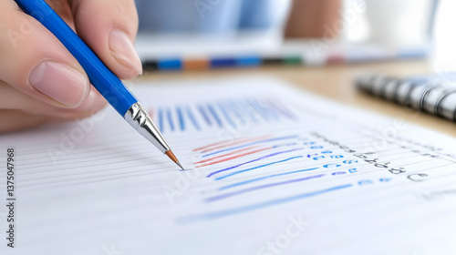 Close-up of a hand annotating a bar chart on paper with a colored pencil . AI generative