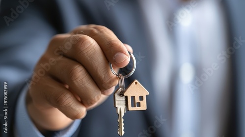 Close-up of a hand holding a house key with a small house-shaped keychain, symbolizing real estate, homeownership, and property.