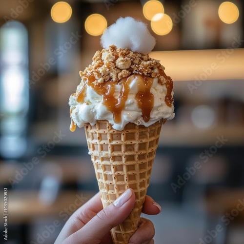 Close-up of a hand holding a waffle cone filled with a creamy white ice cream topped with caramel sauce and crunchy biscuit pieces.