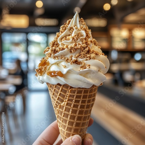 Close-up of a hand holding a waffle cone filled with a creamy white ice cream topped with caramel sauce and crunchy biscuit pieces.