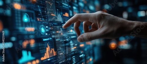 Close-up of a hand interacting with a digital interface filled with data and graphs.