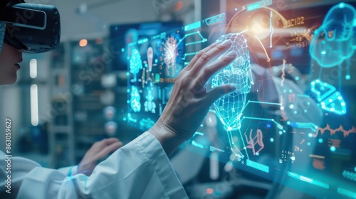 Closeup of a hand interacting with a virtual reality health interface, with copy space