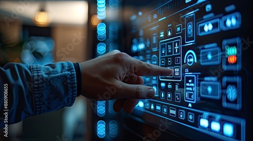 Close-up of a hand using a smart home control panel with digital touch screen controls for home automation.
