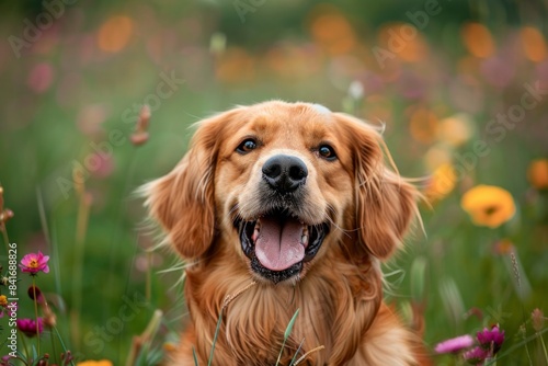 Closeup of a Happy Golden Retriever Dog in a Vibrant Flower Field: Perfect for Themes of Joy, Nature, and Pet Companionship