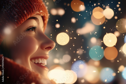 Close-up of a happy person walking through a lively city at night, surrounded by colorful Christmas lights, snowflakes, and festive decorations.