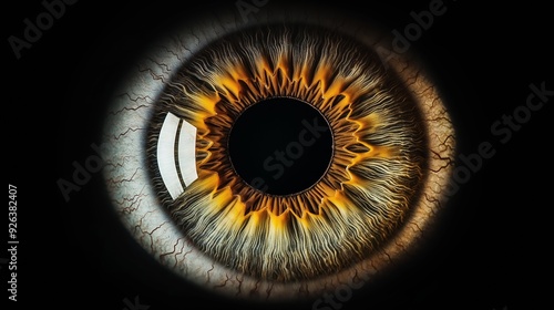 Close-up of a hazel eye with a black pupil and visible bloodshot veins on a white background, showing a serious expression