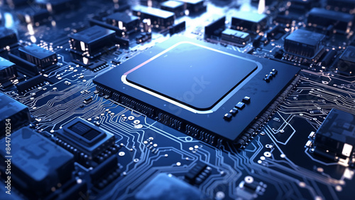 Close-up of a high-tech circuit board with a central processor unit (CPU)