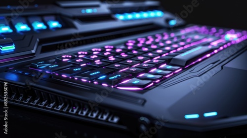Close-up of a high-tech gaming laptop with colorful LED keyboard lighting on a sleek, modern design. Ideal for gaming technology concepts and advertisements.