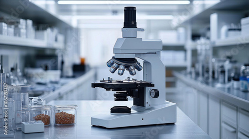 Close-up of a high-tech microscope in a sterile lab, detailed and modern