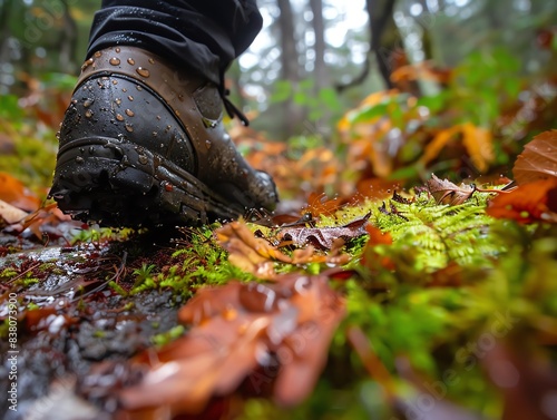 Close-up of a hiking boot on a forest trail surrounded by wet autumn leaves and green moss, emphasizing outdoor adventure and nature exploration.