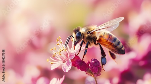 Close-up of a honeybee collecting nectar from a vibrant flower petal in a macro photography style