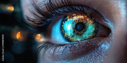 Close-up of a human eye reflecting intricate digital cityscape lights with vivid blue and golden hues, highlighting detailed eyelashes and textured skin