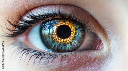 Close-up of a human eye showcasing a minimalistic iris featuring a glowing hexagonal helix pattern that captivates with its intricate design and detail