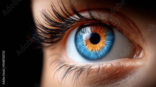 Close-up of a human eye showcasing vibrant colors and detailed eyelashes against a dark background.