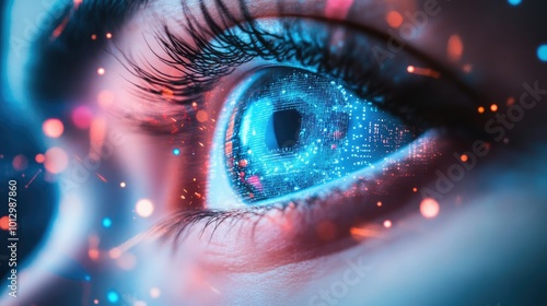 Close-up of a human eye with futuristic digital lights and cyber enhancements, ample room for copy.