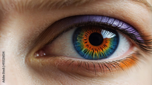 Close-up of a human eye with multicolored iris and vibrant makeup surrounding the eye, very detailed image.