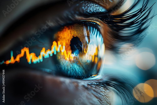 Close-up of a human eye with reflections of data trends, symbolizing insight, analytics, and the fusion of technology and vision.