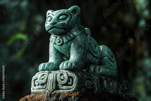 Close-up of a jade jaguar statue resting on a carved stone platform with an out-of-focus green background.