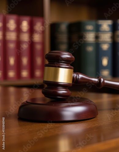 Close-up of a judge's gavel resting on a sound block, with law books in the blurred background.