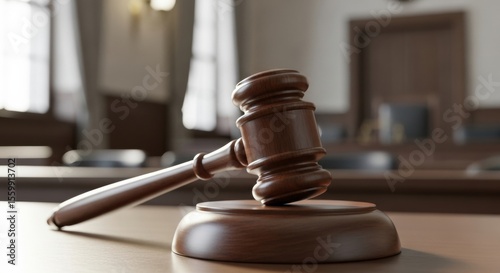 Close-up of a judge's wooden hammer and block on a desk, ready for a legal proceeding in a courthouse setting. A concept for law, order, and final decisions.