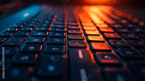 Close-up of a keyboard illuminated by blue and orange lighting