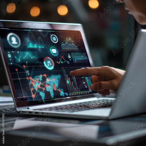 Close-up of a laptop screen displaying productivity software, with a businessman's hand using the touchpad, surrounded by various efficiency-related icons, modern office setting.