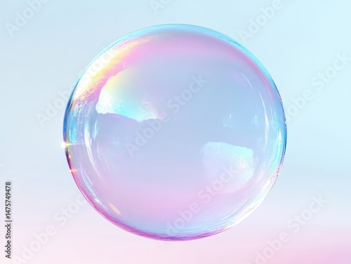 Close-up of a large, colorful translucent soap bubble floating against a soft gradient sky background with pastel hues