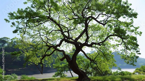 Close-up of a li tree with delicate white flowers blooming on slender branches, showcasing its oval green leaves, smooth bark, and graceful posture in a garden or orchard setting under sunlight