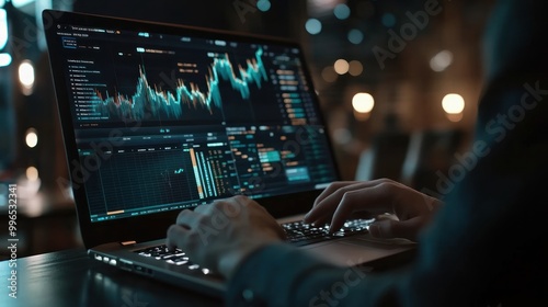 Close-up of a male hands using a laptop to analyze financial data in a dimly lit environment.