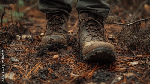 Close-up of a man's boots crunching through fallen pine needles and twigs in a coniferous forest, with small patches of mushrooms and undergrowth along the trail.