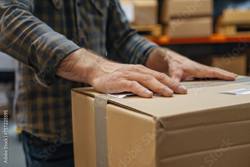 Close-up of a man's hands packing a cardboard box in shop preparing for shipment e-commerce, Logistics, Delivery.