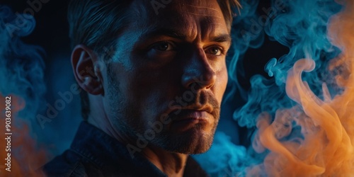 Close-up of a man's illuminated face with vibrant blue and orange smoke, creating a mystical and fiery effect.