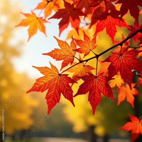Close-up of a maple tree with leaves of fiery red, glowing orange, and sunny yellow, vibrant, background, close-up