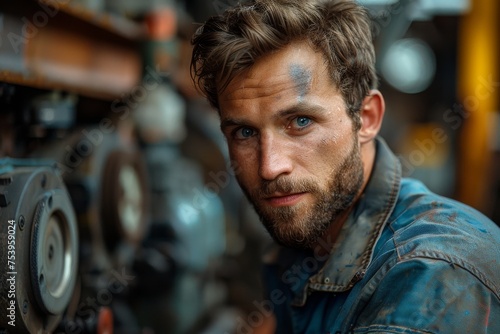 Close-up of a mechanic with a charismatic look and a grease smudge on his face