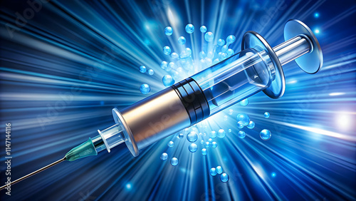 Close-up of a medical syringe filled with liquid, placed on a reflective blue background.