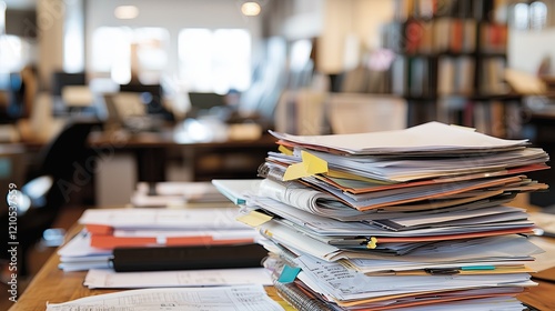 Close-up of a messy pile of documents and reports stacked on an office desk, blurred office background, professional lighting