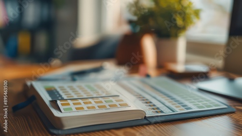 close-up of a meticulously organized budget planner with tabs for different financial categories, sitting on a modern wooden desk