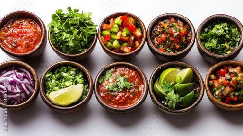 Close-up of a mexican salsa bar with multiple bowls of fresh ingredients and vibrant toppings for culinary enjoyment