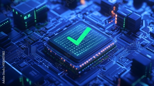 Close-up of a microchip with a green checkmark, representing successful processing and technology validation.