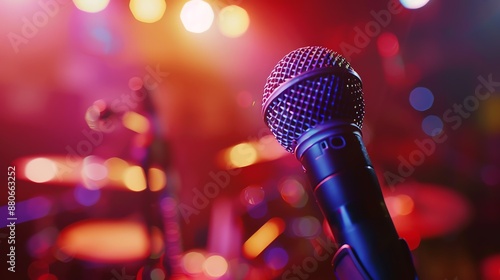Close-up of a microphone on stage with a blurred background of a live music performance.