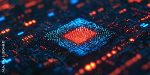 Close-up of a microprocessor chip showcasing intricate circuits and vibrant LED lights. Ideal for tech innovation themes.