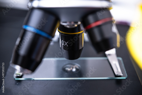 Close-Up of a Microscope Lens Focused on a Glass Slide in a Laboratory Setting for Scientific Research
